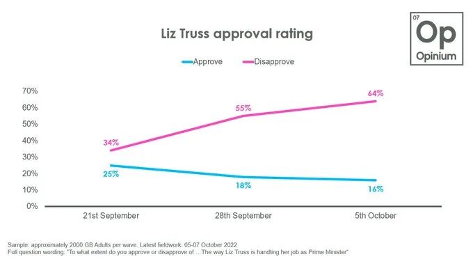 自上周以来,特拉斯的净支持率下降了10%,原因是表示“不赞同”其工作的选民人数大幅增加,上升了9%,达到64%。只有16%的人赞成她正在做的工作。考虑到四舍五入的因素,她的总体支持率为-47%。