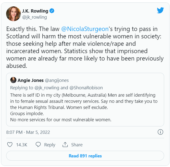 早在2021年12月和今年3月,J.K.罗琳就曾抨击过这项法案。称简化跨性别过程,会让更多“男性”占用天生的女性资源、侵占她们的利益; 而且可能还会带来暴力伤害。