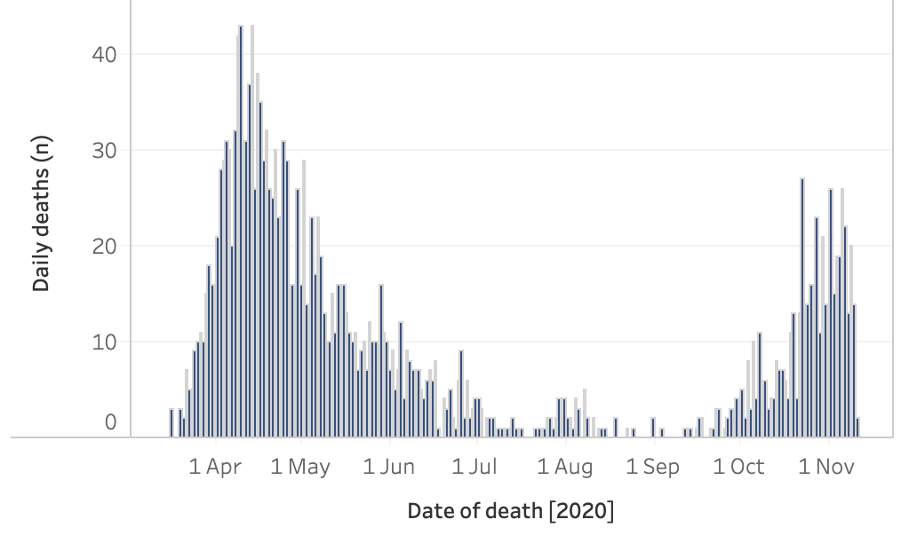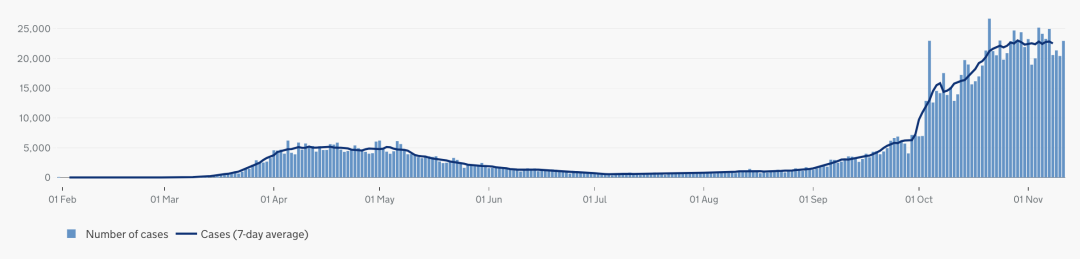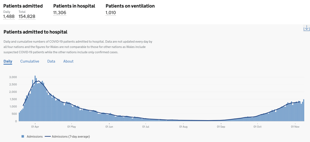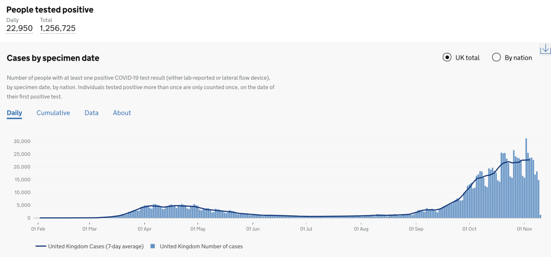 截止至2020年11月11日(周三)英国时间09:00,累计检测结果量34,490,306次(+304,843);累计确诊1,256,725例(+22,950);累计病亡50,365例(+595)。