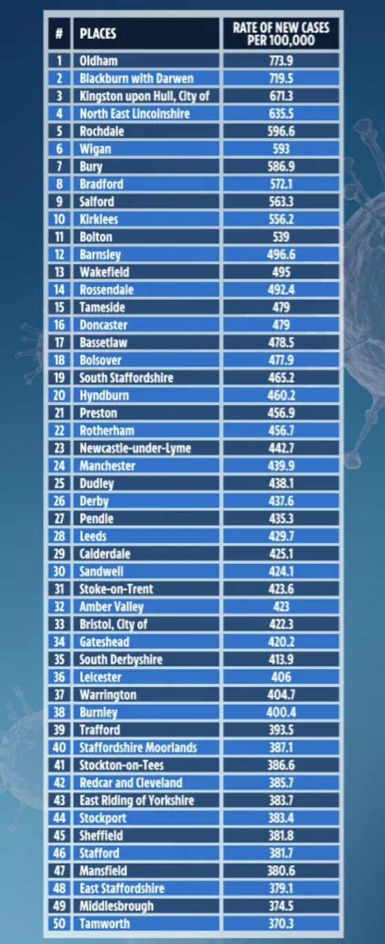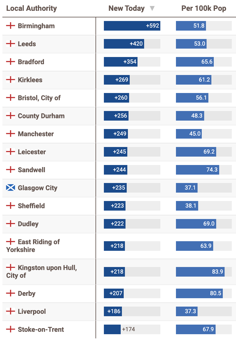 此外,利兹(+420)、布里斯托(+260)、杜伦郡(+256)、曼彻斯特(+249)、莱斯特(+245)、谢菲尔德(+223)、利物浦(+186)等日增几乎均超过200例。