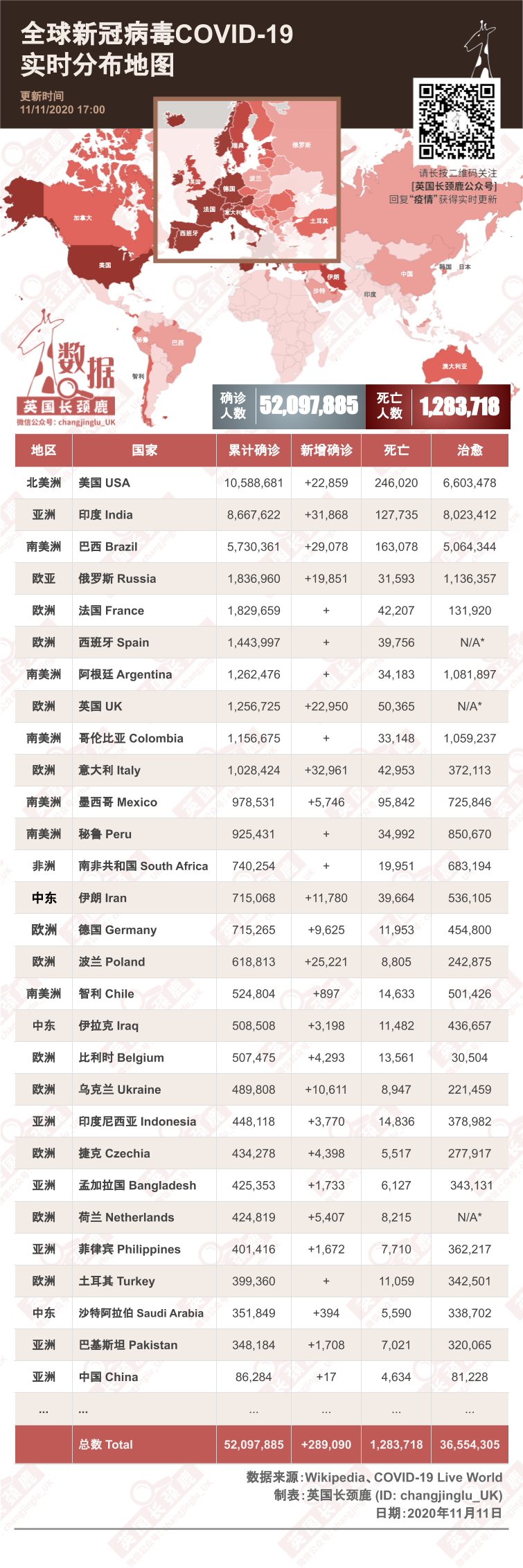世界的累计确诊人数截止11月11日17:00超过5,209万例(+380k),死亡超过128.3万例(+6k)。