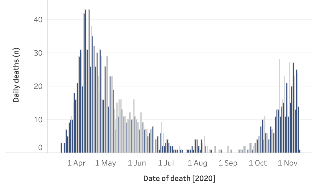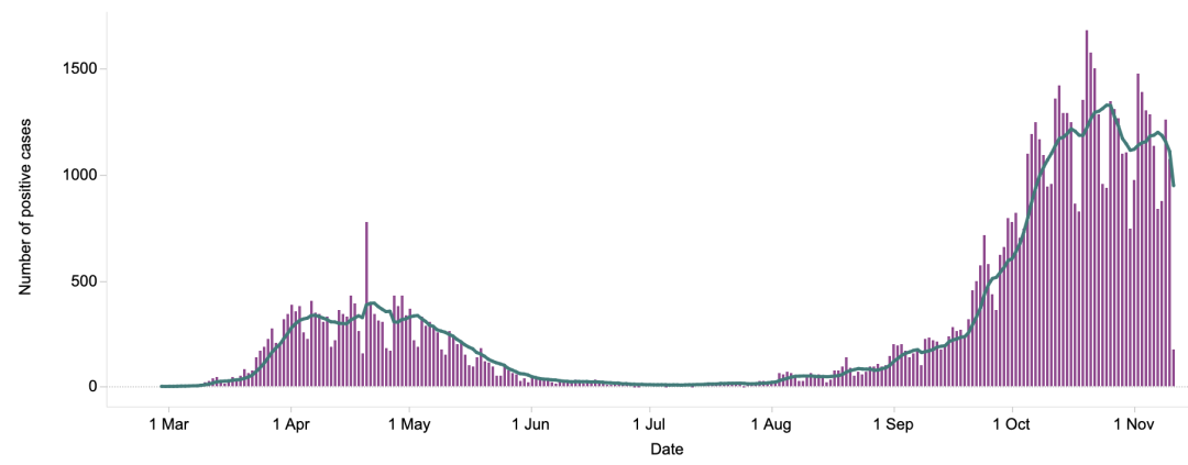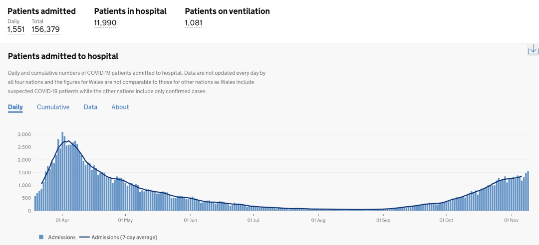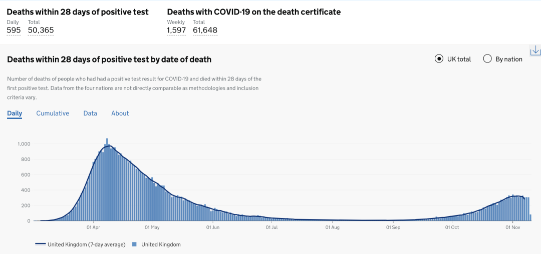 截止至2020年11月12日(周四)英国时间09:00,累计检测结果量34,871,387次(+377,608);累计确诊1,290,195例(+33,470);累计病亡50,365例(待更新)。