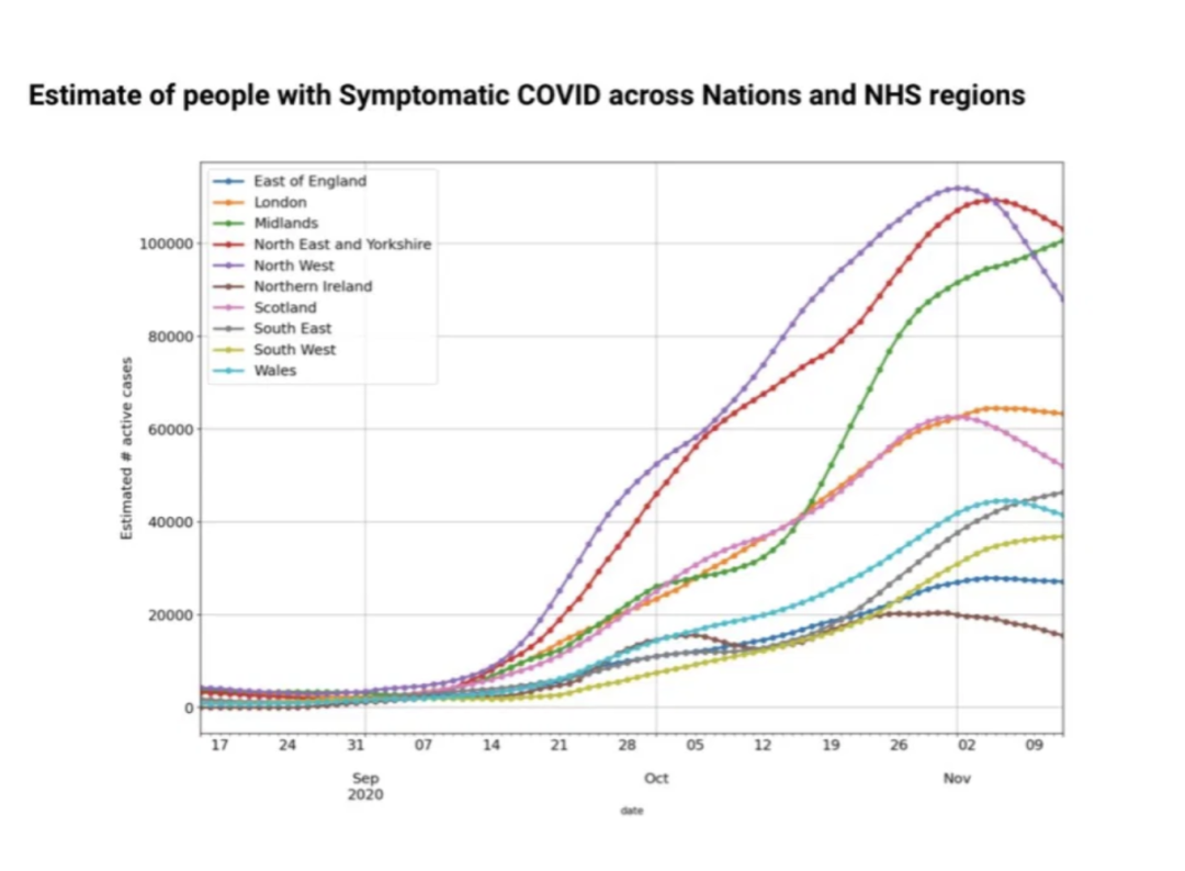 但来自伦敦国王学院的app最新数据表明,R值于11月9日在英国四个地区全部低于1。Tim Spector教授说:“由于大家的努力,现在全英国和四个地区的R值已经全部降至1以下。”