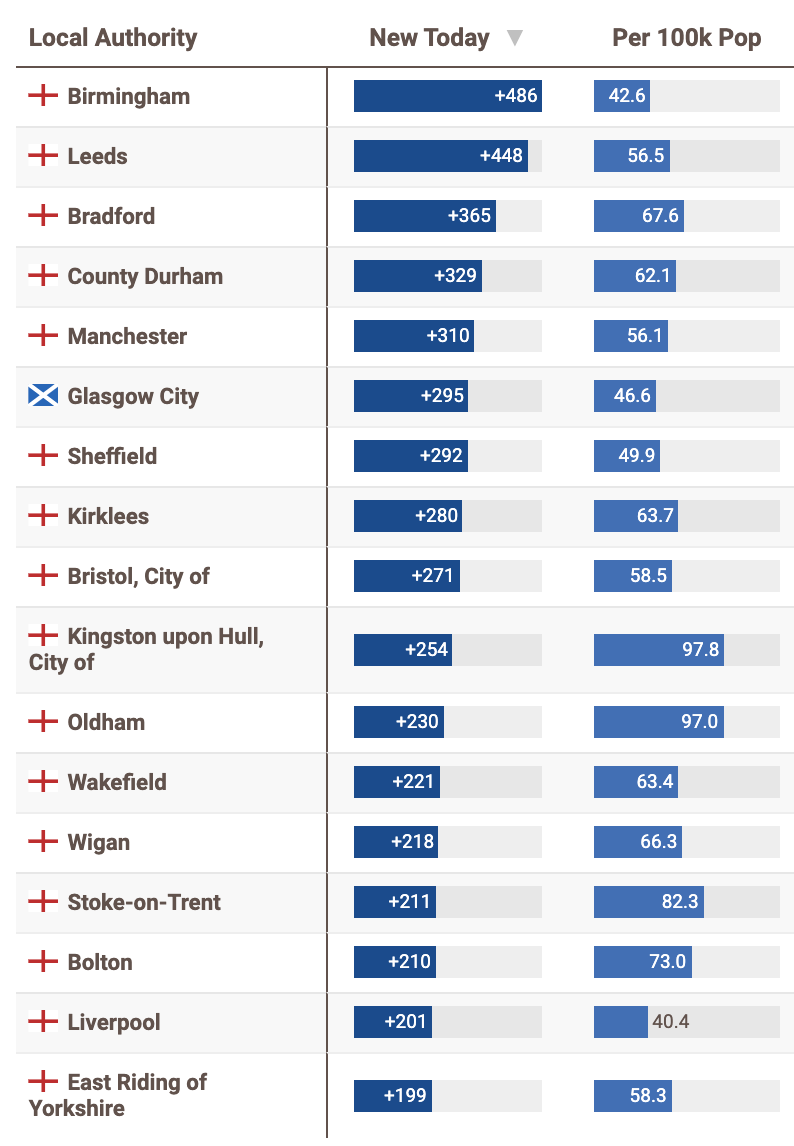 此外,利兹(+448)、杜伦郡(+329)、曼彻斯特(+310)、谢菲尔德(+292)、布里斯托(+271)、利物浦(+201)等日增均超过200例。