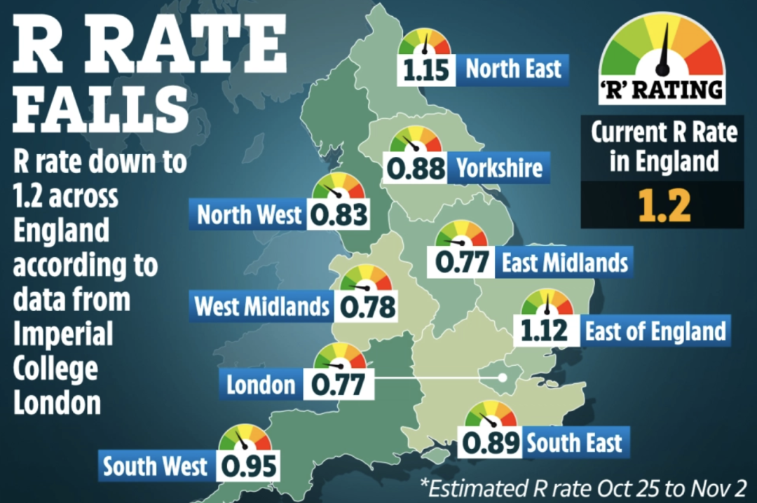 而根据伦敦帝国理工学院的最新报告显示,在全国封锁前,R值为1.2——它作为另一项主要研究,表明在英格兰进入第二次国家封锁的前几天,R值已经开始下降。
