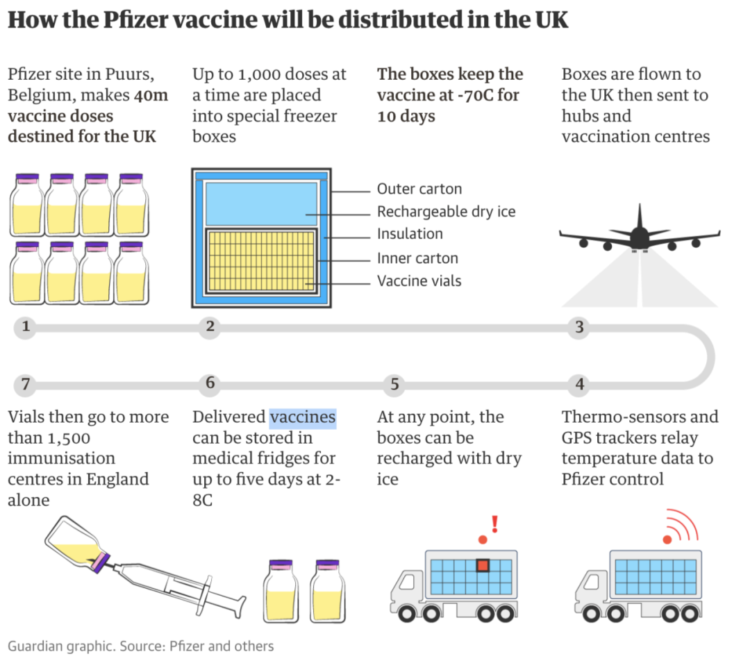 预计Pfizer的其中1,000万剂疫苗将在年底前运抵英国,人们将接种两剂,间隔21天。