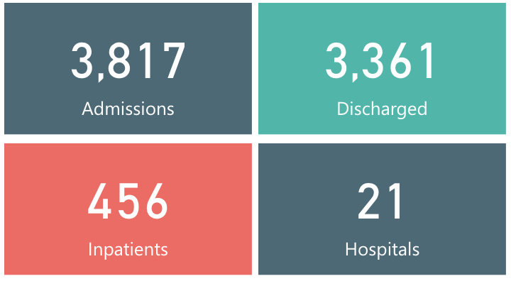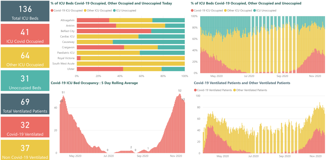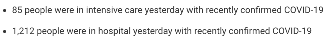 从3月5日以来,苏格兰地区一共有6,898名(+98)确诊患者出院。截至11月19日午夜,近期住院的疑似/确诊新冠患者共1,212名(-29),其中85名(-3)确诊新冠在重症监护室ICU。