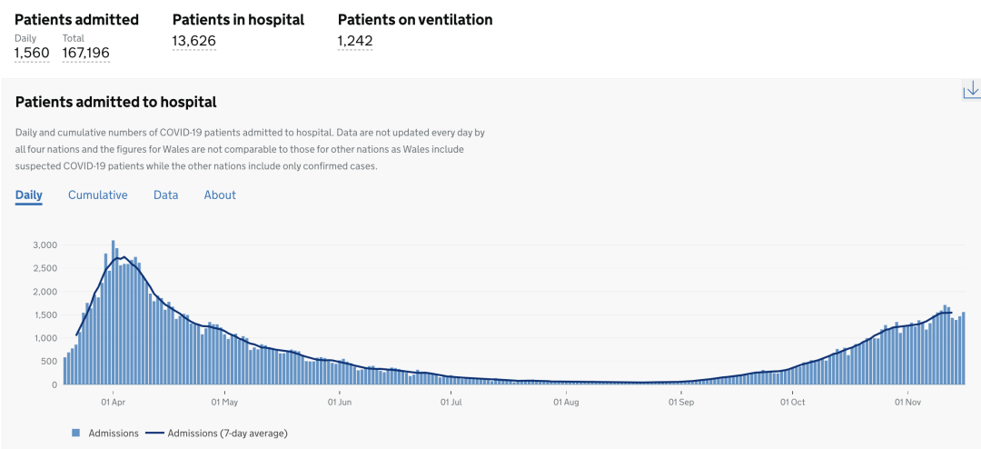 11月19日数据:目前住院的确诊新冠患者13,565人(*),累计住院新冠患者总数为165,636人(*)。