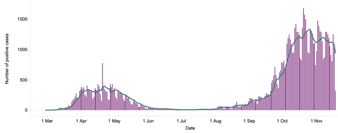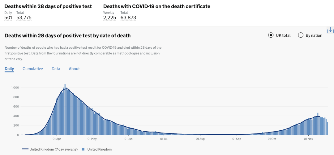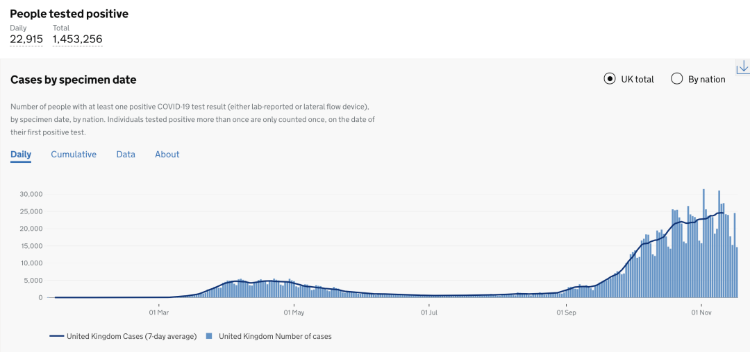 截止至2020年11月19日(周四)英国时间09:00,累计检测结果量37,172,632次(+364,490);累计确诊1,453,256例(+22,915);累计病亡53,775例(+501)。