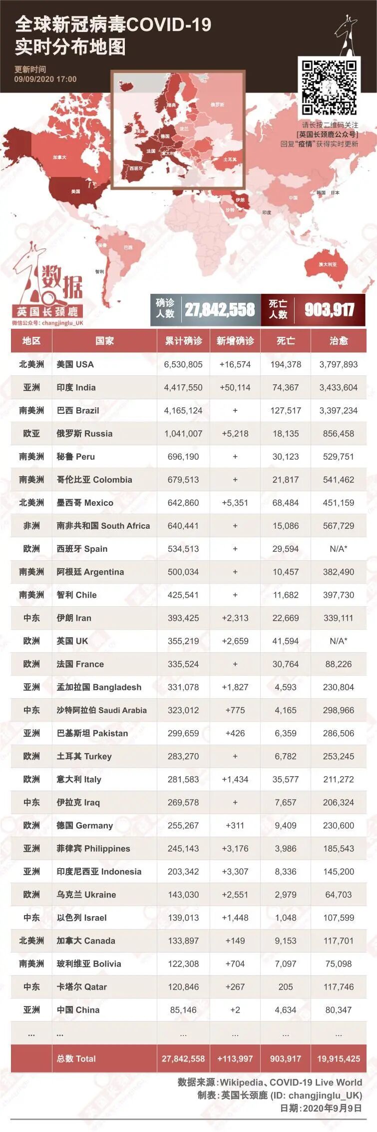 世界的累计确诊人数截止9月9日17:00超过2,784万例(+270k),死亡超过90.3万例(+5k)。