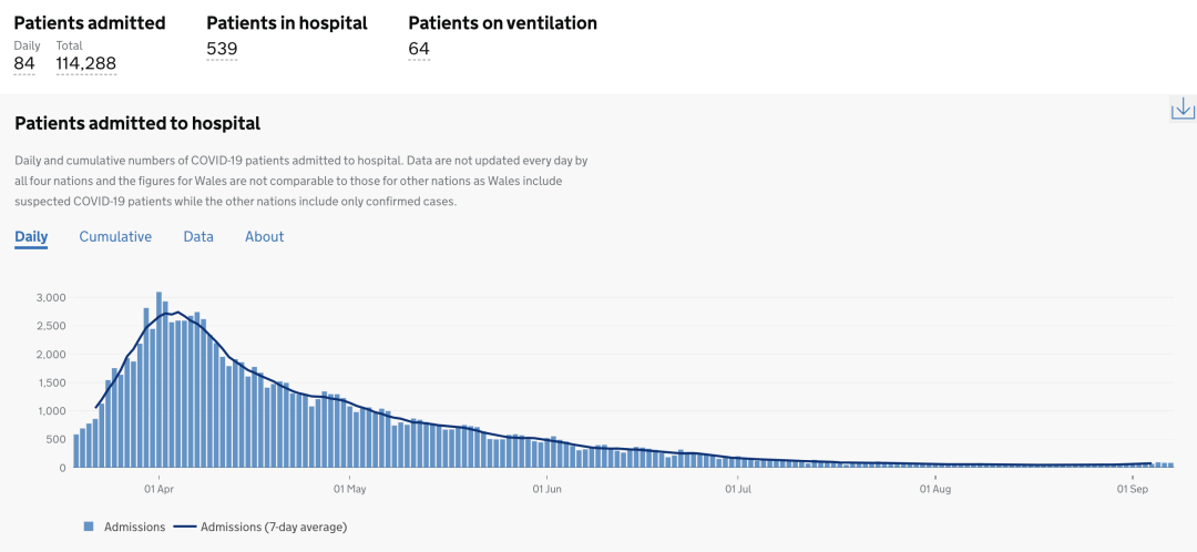 9月9日数据:目前住院的确诊新冠患者539人(+20),累计住院新冠患者总数为114,288人(+84)。