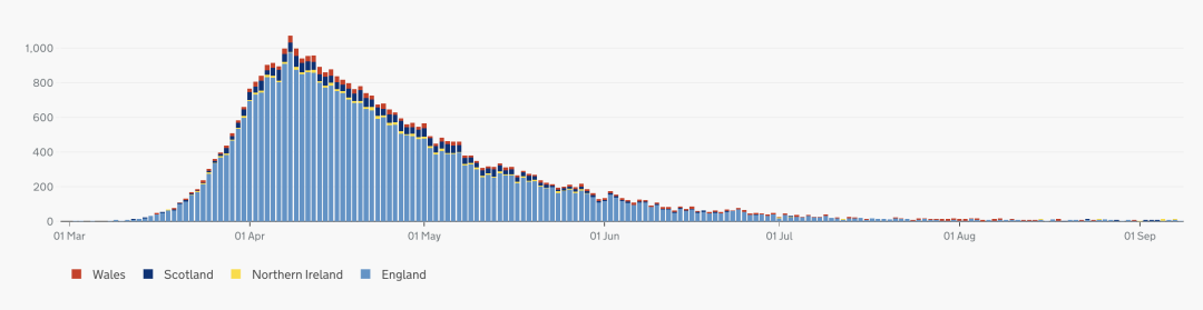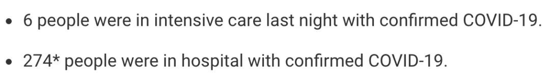 从3月5日以来,苏格兰地区一共有4,259名(+1)确诊患者出院。截至9月9日午夜,住院的疑似/确诊新冠患者共274名(+7),其中6名(=)确诊新冠在重症监护室ICU。
