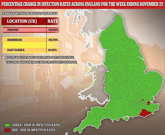 在英格兰全国封锁解封后,新冠疫情分层限制将意味着超过5,500万人从12月2日起仍被禁止与其他家庭在室内混合(2/3级封锁)。其中,米德兰、东北部和西北部的大部分地区,包括曼彻斯特,以及肯特,都在第三级最高级封锁。