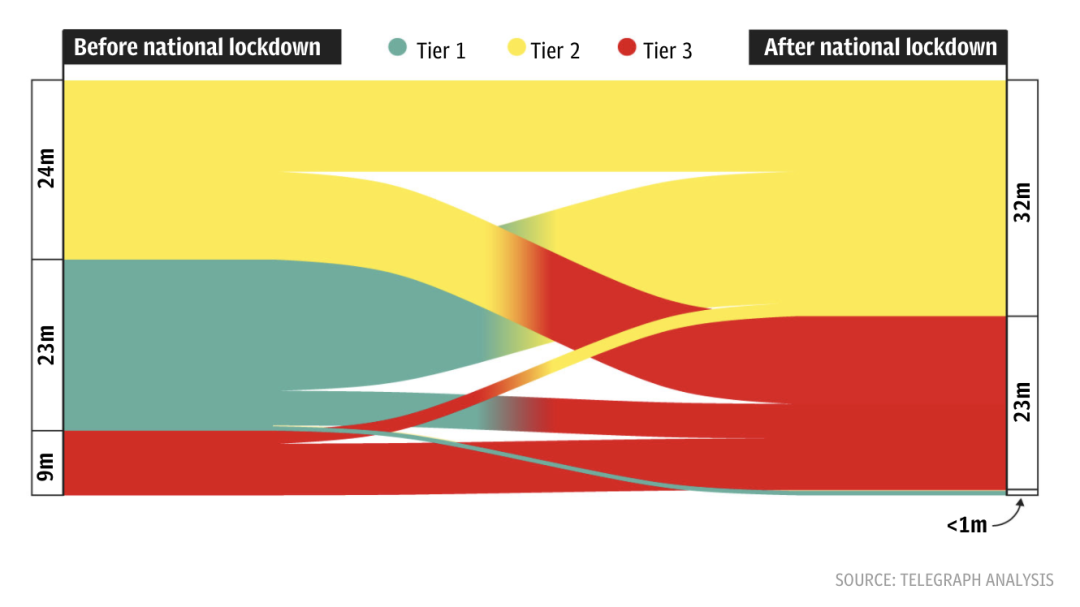 而大部分地方处于第二级封锁,包括伦敦,利物浦等。
