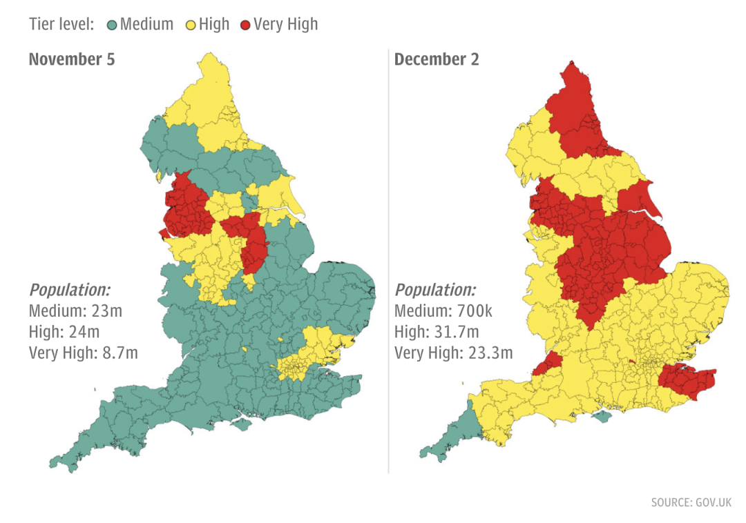 据悉,分层限制系统将定期进行审查,第一次审查定于12月16日进行,一些地区的层级可能在圣诞节前发生变化。