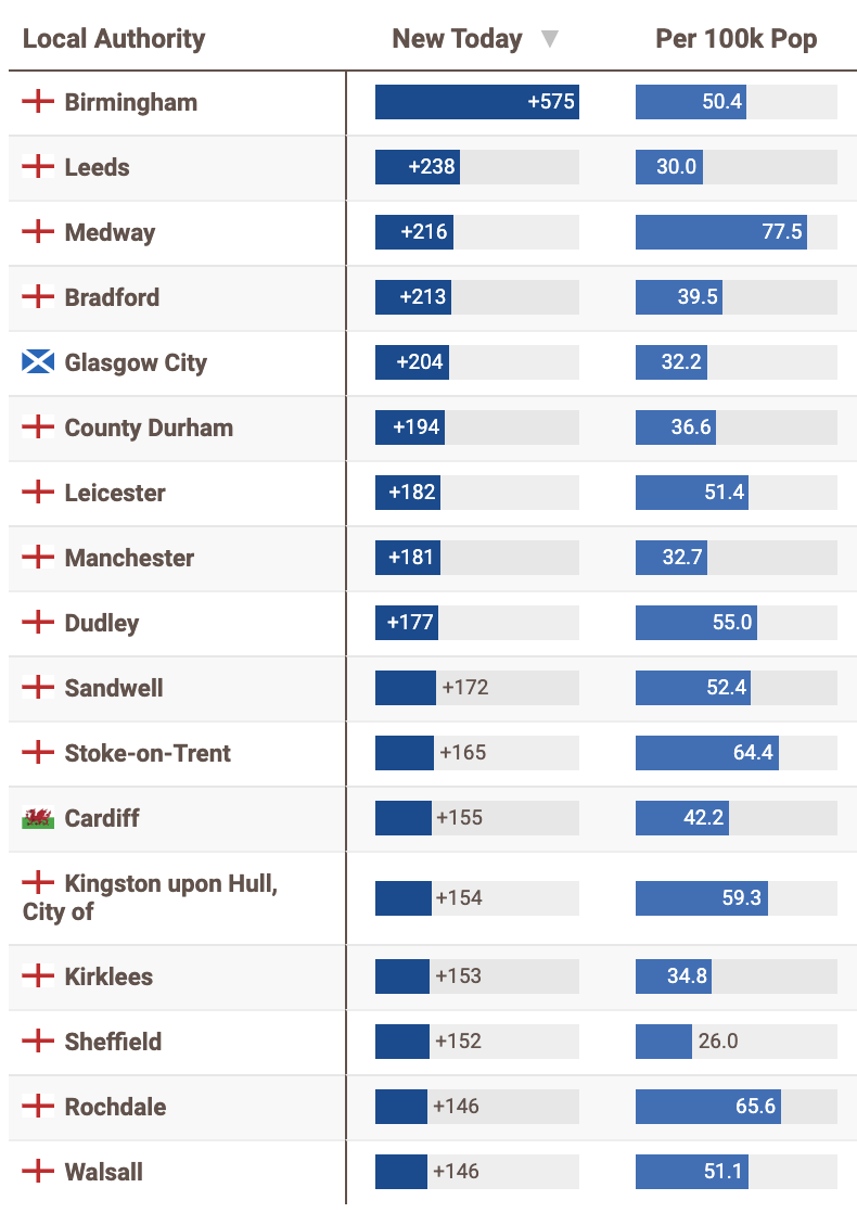 此外,利兹(+238)、杜伦郡(+194)、莱斯特(+182)、曼彻斯特(+181)、谢菲尔德(+152)等日增均超过150例。