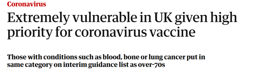 根据英格兰公共健康部门最新公布的临时疫苗优先名单,18岁及以上,且临床表现极其脆弱(clinically extremely vulnerable)的人群将享受和70岁以上人群同样的待遇。