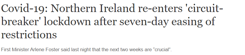 为期两周的circuit-breaker封锁于11月27日在北爱尔兰正式开始实施:所有非必要的零售、休闲和酒店业以及教堂将被关闭,同时不允许举行家庭聚会,学校仍被允许继续开放。