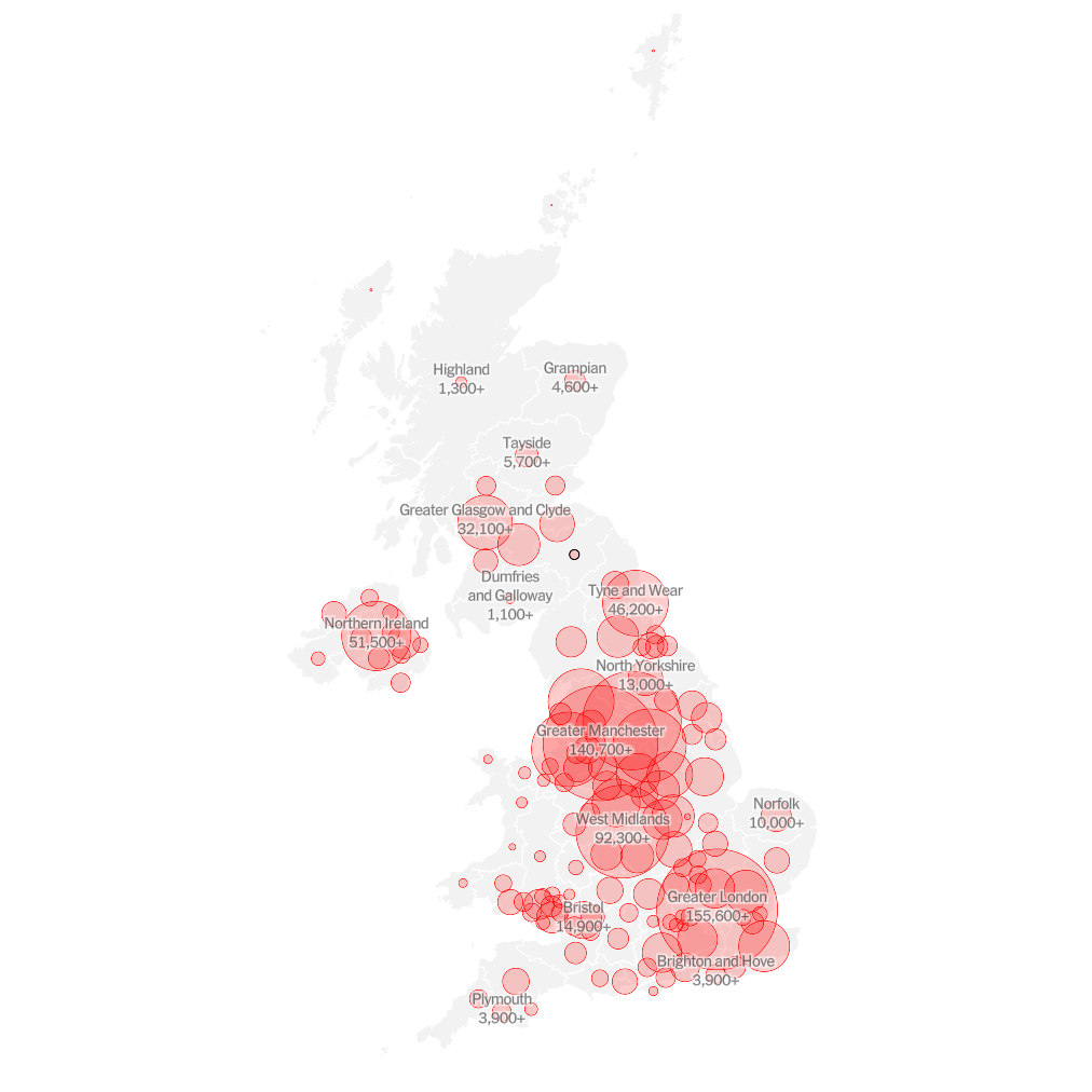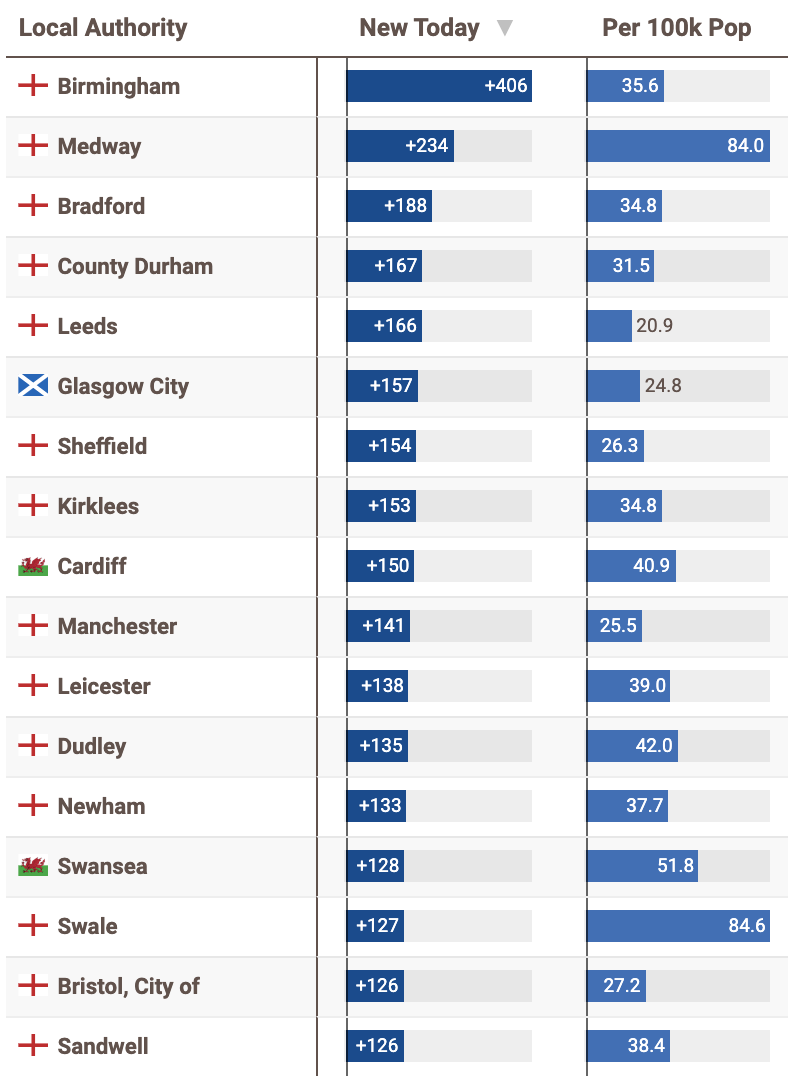 除了英格兰地区,苏格兰地区的格拉斯哥(+157)和威尔士地区的卡迪夫(+150)、斯旺西(+128)疫情数据也较高。