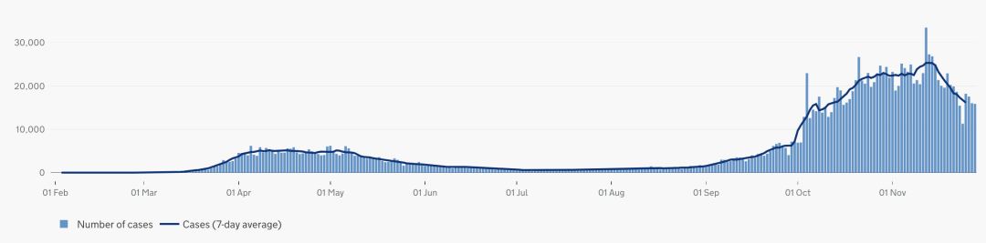 截止至2020年11月28日(周六)英国时间09:00,累计检测结果量39,888,901次(待更新);累计确诊1,605,172例(+15,871);累计病亡58,030例(+479)。