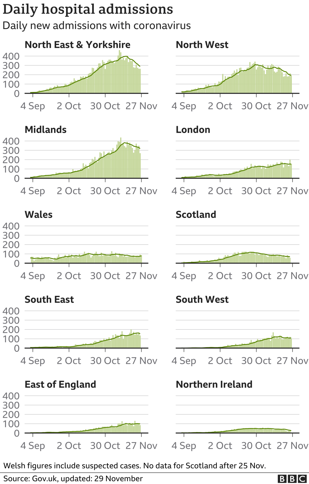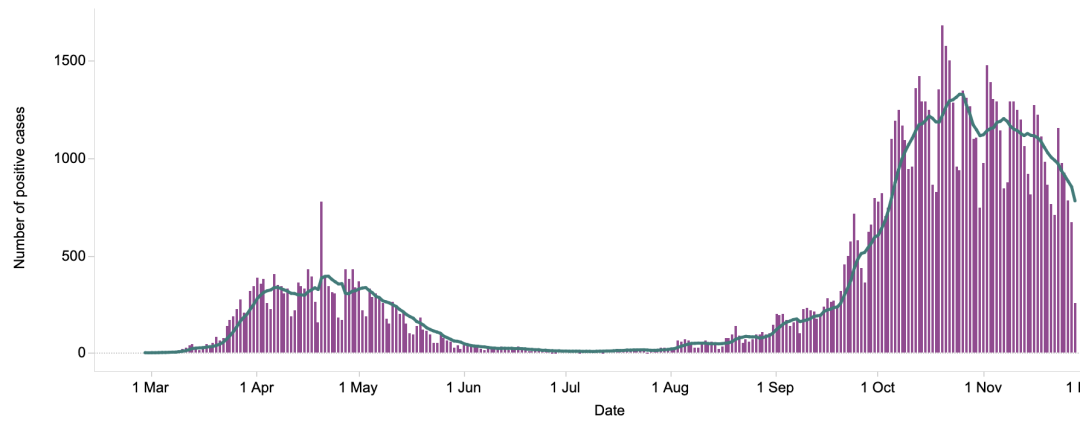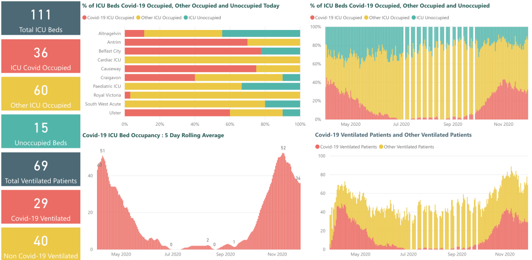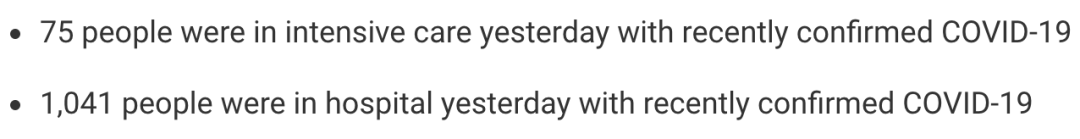 从3月5日以来,苏格兰地区一共有7,533名(+19)确诊患者出院。截至11月30日午夜,近期住院的疑似/确诊新冠患者共1,041名(-8),其中75名(-1)确诊新冠在重症监护室ICU。