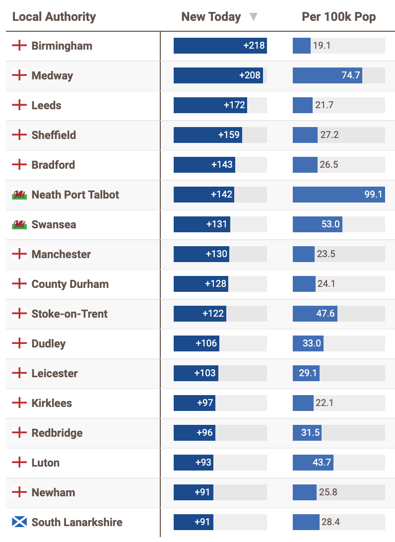 除了英格兰地区,威尔士地区Neath Port Talbot(+142)、斯旺西(+131)以及苏格兰地区的South Lanarkshire(+91)疫情数据也较高。