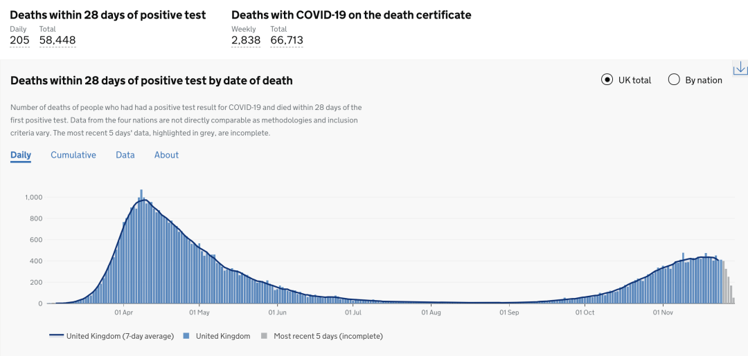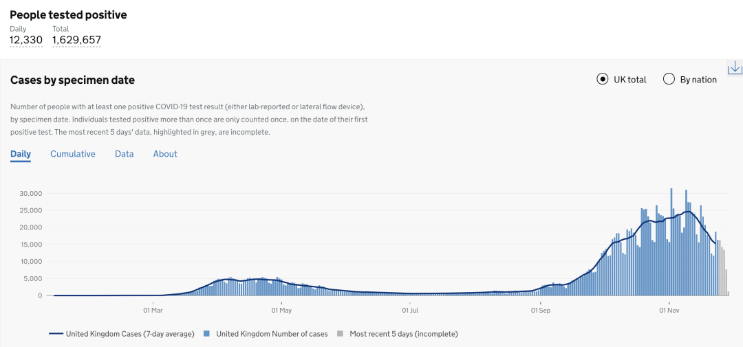截止至2020年11月30日(周一)英国时间09:00,累计检测结果量40,756,444次(+219,899);累计确诊1,629,657例(+12,330);累计病亡58,448例(+205)。