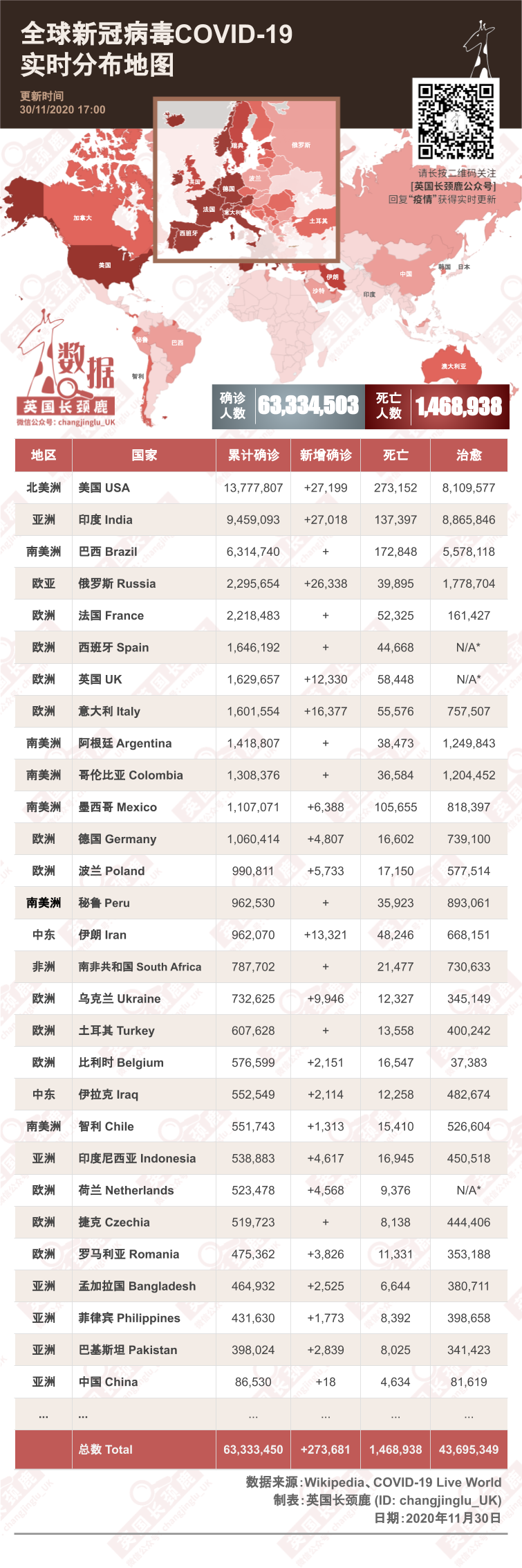 世界的累计确诊人数截止11月30日17:00超过6,333万例(+51k),死亡超过146.8万例(+6k)。