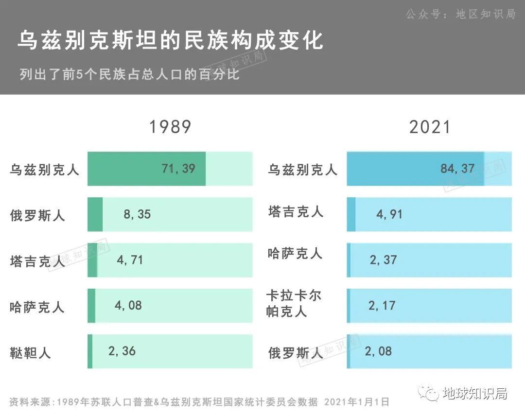 值得注意的是,解体后中亚各国的主体民族比例变化:乌兹别克斯坦从71%上升到84%,塔吉克斯坦从62%上升到84%,哈萨克斯坦从39%上升63%,吉尔吉斯斯坦从52%上升到73%,土库曼斯坦从72%上升到91%。