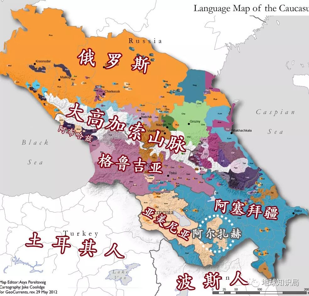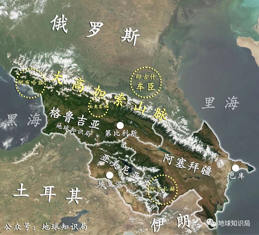 在高加索山脉北麓,俄罗斯境内,就有蠢蠢欲动的车臣、印古什等以少数民族划分的聚居区。而翻过高加索山到了南麓的格鲁吉亚境内,则有阿布哈兹和南奥塞梯两个已经事实独立的共和国。再往南去,到了亚美尼亚和阿塞拜疆的边境地带,还有一个窝在山中的阿尔扎赫共和国,成为了两国交战的前线。