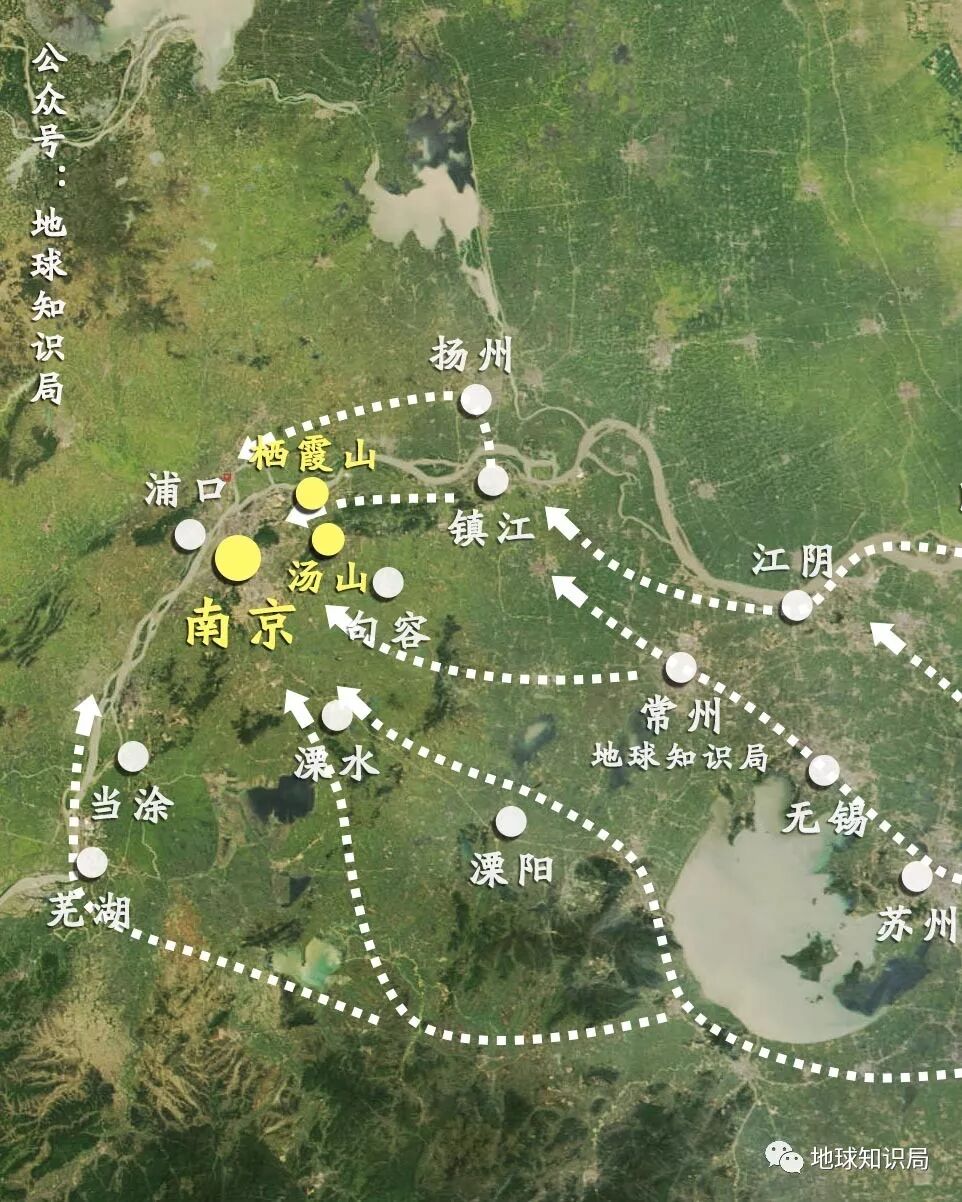 在水路上,长江在南京城西北拐了个弯,从南北向转为东西向,紧接着就沿着扬州镇江和太湖平原一路奔涌向东海。由于几乎是一个直角弯,长江便为南京提供了西、北两个方向上的天险,可以以一个较小的角度依仗水利抵抗北方来敌。