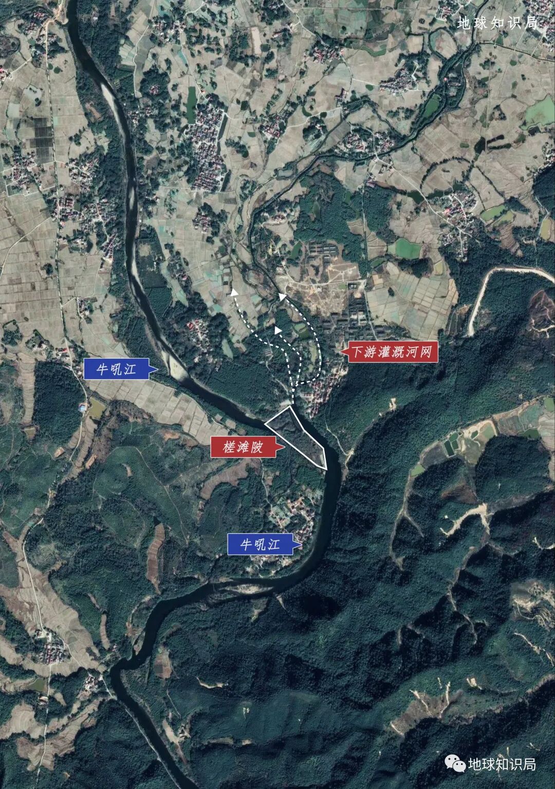 周矩父子在牛吼江大角度转弯后的水流缓慢处拦河筑坝,以减轻流水对坝体的冲击力。陂坝顶高度略低于河岸。