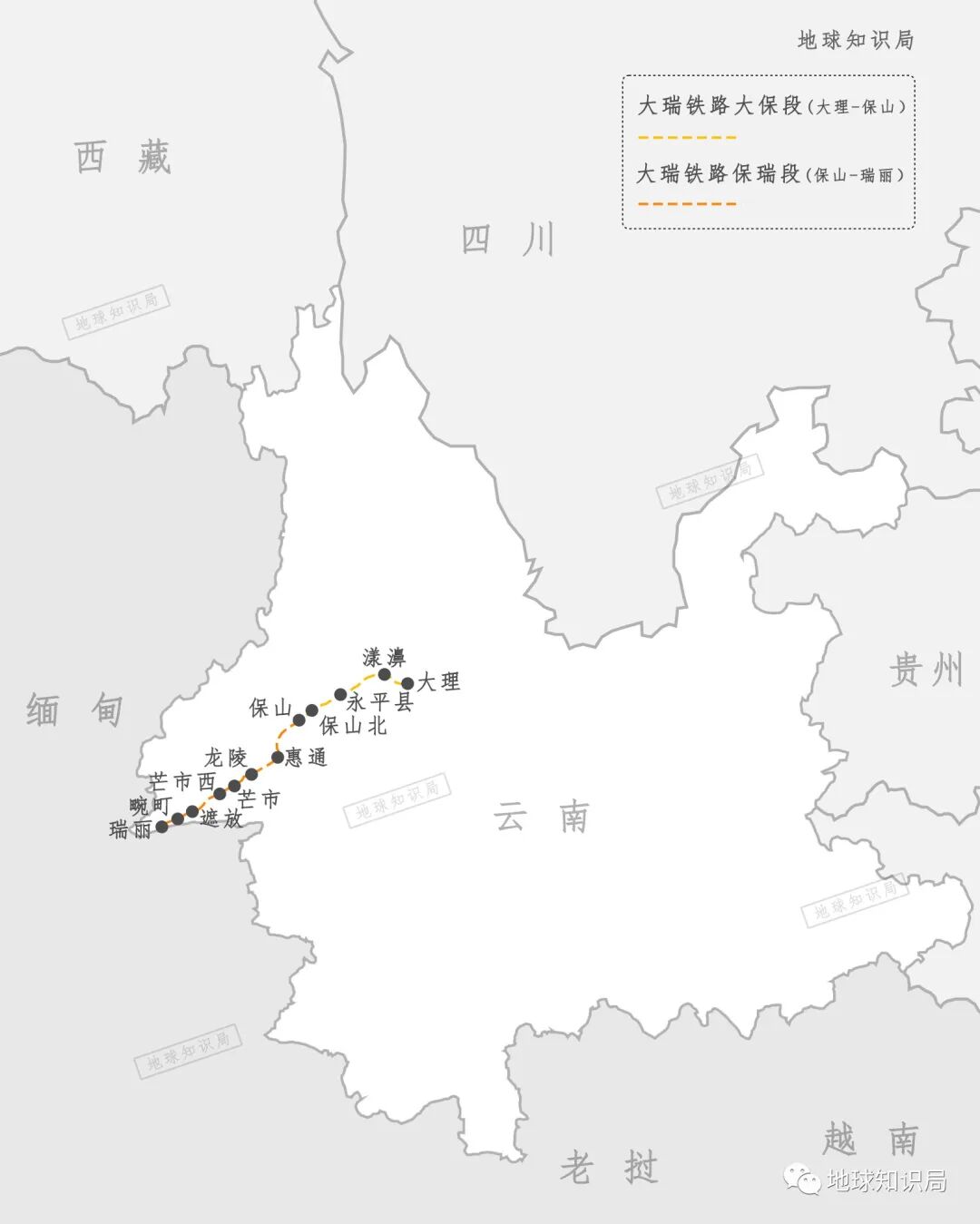大瑞铁路,全线位于云南省境内,东起大理市,西至中缅边境城市瑞丽市,全长330公里,沿线有白、彝、回、傈僳、苗、纳西等10多个少数民族聚集区。