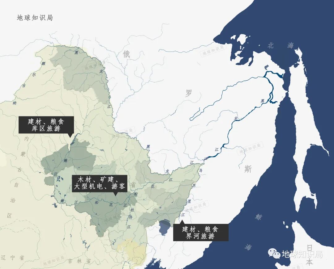 支流再进一步细分的话,松花江以沿江煤炭、木材、矿建、大型机电设备等大宗物资运输和库区旅游客运为主;乌苏里江以建材、粮食等物资运输和界河旅游客运为主;嫩江以建材、粮食等物资运输和库区旅游客运为主。