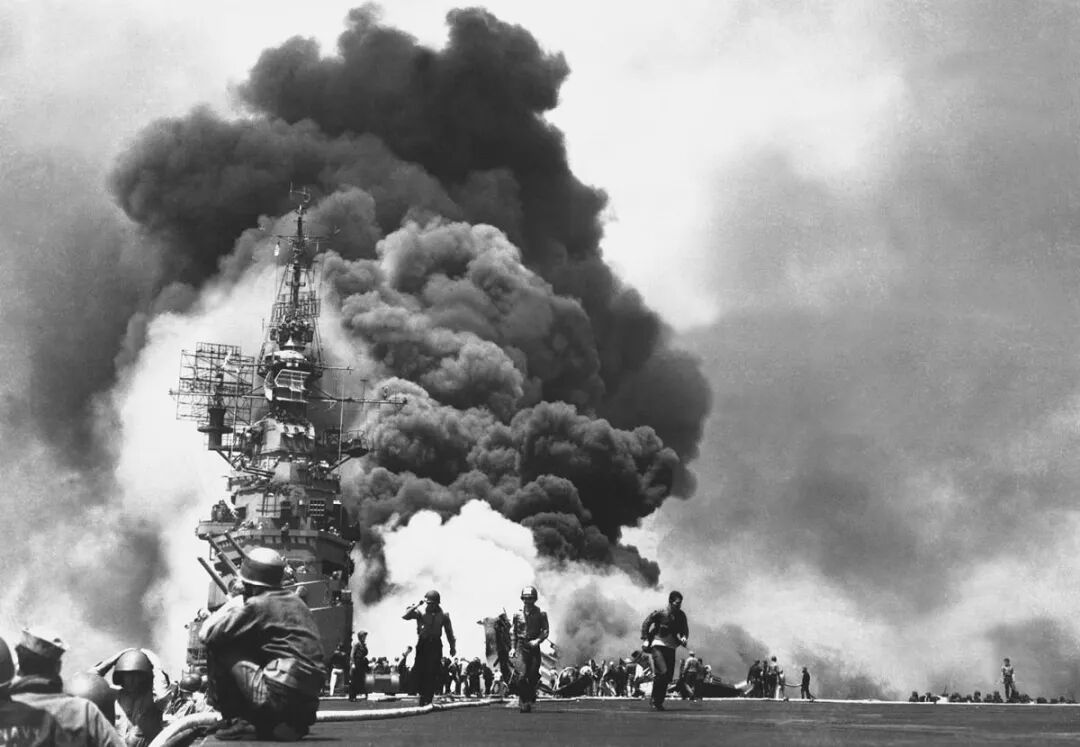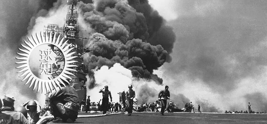在冲绳战役中遭到日军自杀式攻击的美军航母