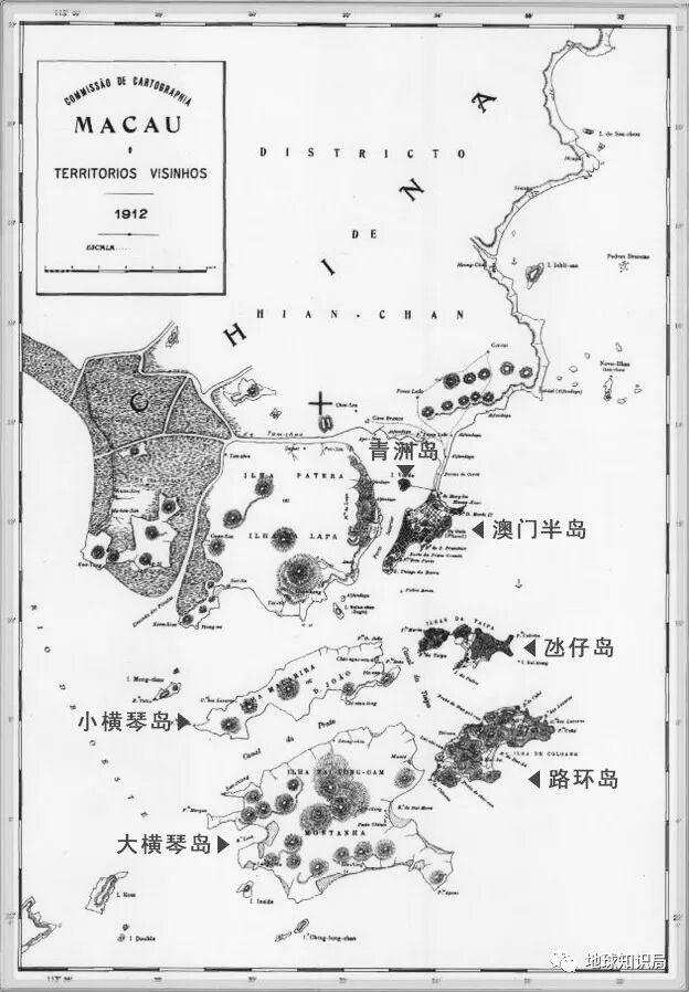 1912年的澳门半岛、氹仔岛(分成三个)及路环岛