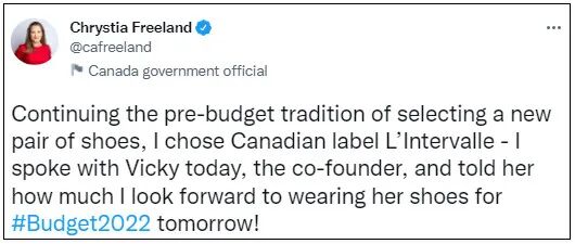 昨天加拿大财长方慧兰在推特上发布自己买鞋的视频后,也就意味着新的财政预算案尘埃落定。