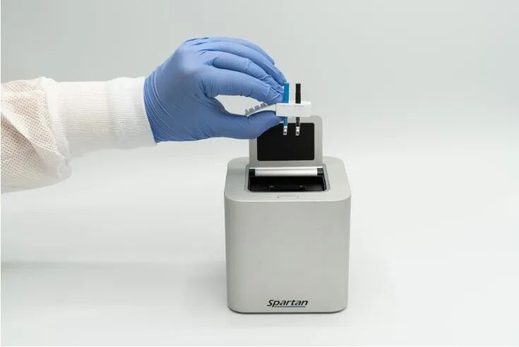 斯巴达生物科学公司(Spartan Bioscience)在新冠病毒大流行早期就制造了轰动效应,该公司声称,其在安大略省制造的便携式测试方盒可以在不到一小时内检测出新冠病毒,而无需去实验室进行检测。用户只需要用棉签擦拭鼻孔,将测试管插入方盒,然后等待结果就好。