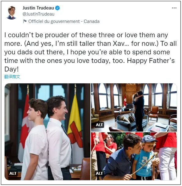 加拿大总理杜鲁多父亲节在推特上发布了和三个孩子的合影。