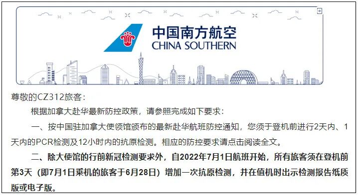 来自中国南方航空官方最新消息,多伦多搭乘南航CZ312飞往广州的乘客,除了满足驻加大使馆的检测要求外,还需提前三天在大多伦多地区做一次抗原检测。