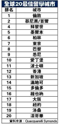 总部位于英国的Quacquarelli Symonds,根据六项指标量度对符合评审资格的城市进行排名,指标包括当地大学排名、学生组成、城市向往度、雇主招聘活跃度、生活成本负担能力,以及学生评价。