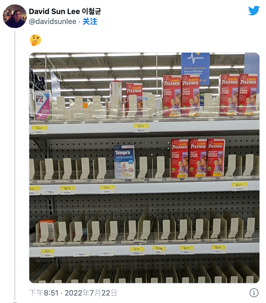 7月初,一位推特用户写道:“当地超市的止咳糖浆货架上几乎空无一物。(但其他东西都是很充足。)”