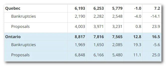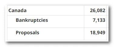 在加拿大范围内,有26,082份申请,比去年增长11%。绝大部分是个人破产,商业破产仅占796分。