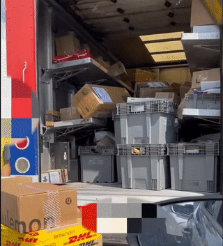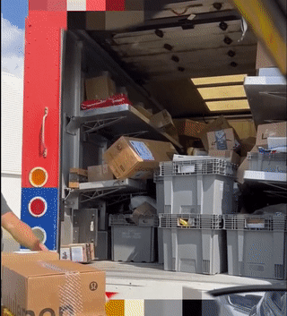 他将六个大小不一的快递包裹随意扔到卡车内部,对快递落在哪里或里面有什么没有任何明显的担忧。