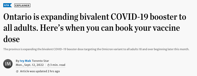 安省今日宣布开打二价疫苗,所有18岁及以上的居民将有资格获得二价新冠疫苗。