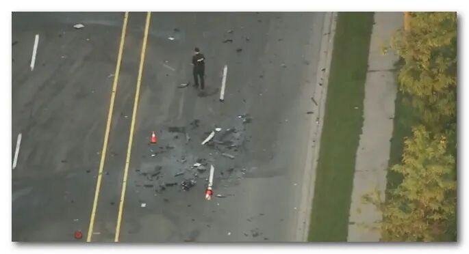 可以看到碎片散落在道路上,碰撞的力量似乎已经将本田车发动机撞散。