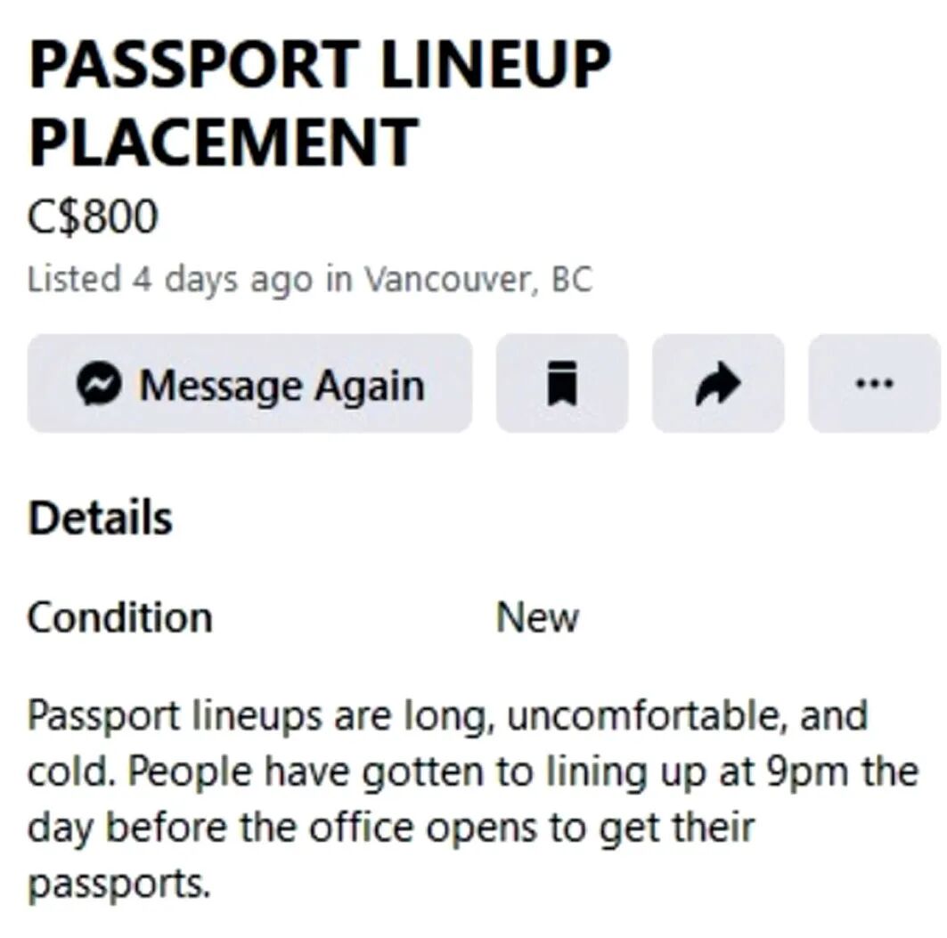 广告贴文中更写到:“如果你没有预约领取护照,你便需要通宵排队,我会为你代劳,这样你便可以在早上8时30分才出现,还可以舒服地睡觉。”据悉,该贴文主人自称卑诗大学(UBC)学生,但她向媒体表示,自上周四发表贴文以来,暂时仍未找到客户。