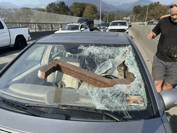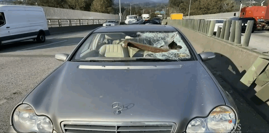 温哥华警方认为,这根横梁从一辆相反方向行驶的货车上飞了出去,反弹到桥面上,跳过中间的路障,最后落在米尔恩车辆的挡风玻璃上。