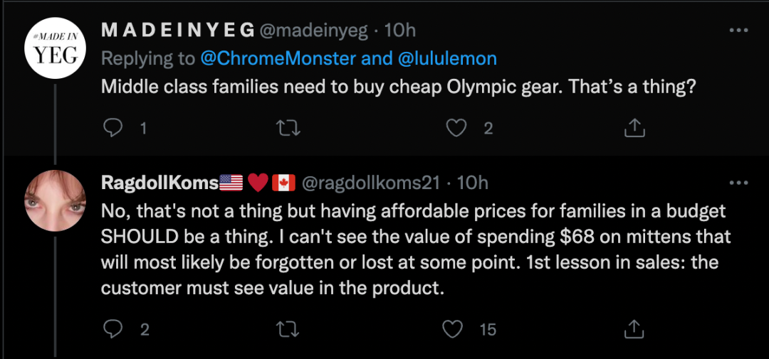 “天呐,你们剥夺了中产家庭购买奥运会周边的权利。$68一双手套?我之前在The Bay买这些只要$10-20。太荒谬了,不是这样庆祝的。”