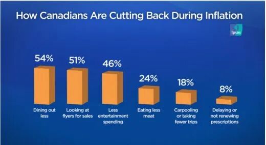 Global News报道,根据Ipsos民调公司调查发现,民众正努力通过不同方式来因应通胀。54%的受访者表示他们减少外出用餐,其他常见的策略包括推迟购买衣服(47%)和削减娱乐支出(46%)。高油价也影响了加拿大人的出行方式,约18%的人表示,他们拼车共乘的次数增加了或出行次数减少了。